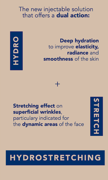 A biological process of hydration and tissue restructuring, together with a mechanical action to stretch the most superficial wrinkles, in a precise and natural way, resulting in its unique HYDROSTRETCH action.
